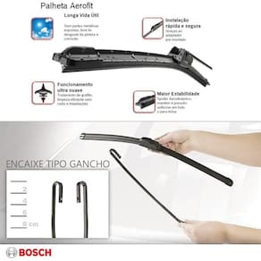 Palheta parabrisa gm agile 2009 a 2011 bosch aerofit par bosch a melhor marca de palhetas com inovação e tecnologia para seu carro. Esta palheta do vidro vigia, também conhecido como palheta do parabrisa traseiro, passou por rigorosos testes de qualidade atendendo todas as exigências do seu equipamento, além de serem fabricadas pela bosch líder mundial no segmento de limpador automotivo. Especificação técnica: haste em plástico maleável spoiler aerodinâmico: pressão uniforme em todo o vidro sem partes metálicas expostas revestimento em borracha que reduz a fricção com o vidro limpeza silenciosa adaptador pré-montado para uma fácil instalação resiste às mais diversas condições climáticas longa vida útil para veículos com braço tipo gancho substitui a palheta convencional instalação rápida e segura tamanho disponível: 18 polegadas e 22 polegadas aplicação: af18 gm camaro 2018 a 2020 af22 gm camaro 2018 a 2020 conteúdo da embalagem: 01 palheta bosch aerofit 18 18 polegadas 450mm lado passageiro 01 palheta bosch aerofit 22 22 polegadas 550 mm lado motorista importante: por que trocar a palheta do limpador de para-brisa pode parecer estranho, mas o maior problema para as palhetas não é ter uso intenso durante chuvas, mas sim o ressecamento em dias de sol. O calor e a forte incidência de raios uv afetam a composição da borracha e diminuem a durabilidade da palheta. Esse ressecamento, aliado ao desgaste natural do tempo, dificulta o funcionamento de todo o limpador de para-brisa. Em resumo: a visibilidade será prejudicada em dias de chuva. Por isso, a troca deve ser feita. É uma questão de segurança. O ideal é fazer a troca antes do período de chuvas. Como identificar a hora da troca como dissemos, o ideal é trocar as palhetas anualmente. Mas é preciso ficar atento para os sinais de ressecamento e desgaste, que tornam imediata a necessidade da substituição das palhetas do limpador de para-brisa. Os principais sinais de que a hora de trocar chegou são o vidro cheio de riscos e o excesso de barulho durante o funcionamento. Dica e-usy a dica e ficar de olho no funcionamento das palhetas, pois palhetas desgastadas podem causar riscos no para-brisa, e assim dificultar a visibilidade ao dirigir, causando a necessidade prematura da troca do para-brisa, aumentando em muito o custo de manutenção. Recomendamos que a instalação seja feita por profissional especializado e não nos responsabilizamos pelo mau uso do produto. Garantia de 03 meses contra defeito de fabricação imagens meramente ilustrativas