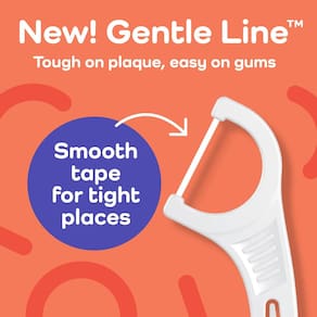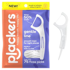 Palillos dentales con hilo Plackers Gentle Line, sabor menta fresca, Palillo plegable FlipPick, agarre QuickFix, almacenamiento fácil con sello Sure-Zip, 75 unidades. - SONRISAS POR MONTONES: Incluye 75 palillos con hilo dental para eliminar la placa y mantener tu sonrisa. - TECNOLOGÍA GENTLESLIDE: Tecnología GentleSlide que se desliza un 50 % más fácil comparado con hilo de nylon; suave para dientes y encías sensibles. - FLIPPICK: Palillo plegable para limpiar los dientes que se pliega para seguridad y comodidad, perfecto para guardar durante viajes o en casa. - AGARRE CÓMODO: Agarre QuickFix que ofrece mejor control y alcance en espacios difíciles al usar hilo dental. - ALMACENAMIENTO FÁCIL: Bolsa resellable con sello Sure-Zip para un gran almacenamiento para el cuidado dental en movimiento o en casa.