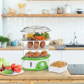 O Healthy Steam Ariete traz a técnica de cozimento a vapor para o dia a dia de forma prática, rápida e muito mais saudável. Em apenas 40 segundos o vapor está pronto para preparar arroz, carnes, peixes, frutos do mar, legumes e ovos mantendo nutrientes, textura e sabor, sem excesso de óleo ou gordura. Com 3 bandejas empilháveis + recipiente próprio para arroz, é possível cozinhar diferentes alimentos ao mesmo tempo, ideal para quem busca alimentação equilibrada com menos processos e mais eficiência. O tanque possui nível de água visível e pode ser abastecido até durante o uso, facilitando a rotina e tornando o preparo mais simples. Uma solução inteligente para refeições leves, nutritivas e completas para toda a família.