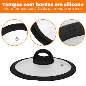 A tampa também possui bordas em silicone preto, é feita de vidro temperado com saídas para vapor em inox, trazendo um design inovador, ideal para você que gosta de sofisticação e elegância em sua cozinha.