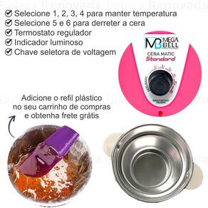 CERA MATIC STANDARD pertence à Linha CERA MATIC MEGA BELL, uma linha de aquecedores profissionais de cera em barra para depilação, com design moderno e diversas opções de cores. Derrete e armazena a cera na temperatura ideal. Nela, podem ser utilizadas ceras em tabletes ou granuladas, deixando o trabalho muito mais rápido e eficiente. Aquecedor profissional ou doméstico para cera de depilação. Equipado com termostato para regulagem de temperatura, indicador luminoso de funcionamento e chave seletora de voltagem. Seu corpo de ABS é resistente à altas temperaturas, e sua resistência blindada, a torna totalmente segura. INSTRUÇÕES DE USO: Antes de conectar o aparelho à tomada, verifique a voltagem correta (110V ou 220V) e ajuste a chave seletora que se encontra na parte de baixo do aparelho. Colocar a cera no recipiente, ligar o aparelho e ajuste o botão de temperatura entre 5 e 6 , até que a cera derreta. Quando a cera estiver derretida, posicionar o botão de ajuste de temperatura de acordo com a necessidade do trabalho. CUIDADOS E PRECAUÇÕES: Não ligue o aparelho sem cera no recipiente. Não aperte ou puxe o botão quando ligar ou regular a temperatura. Não use o aparelho em locais molhados. A OPÇÃO COM REFIL (PANELINHA DE ALUMÍNIO) É INDICADA PARA FACILITAR A HIGIENE DA TERMOCERA E AUMENTAR A DURABILIDADE DA MESMA. Contém: 01 Aquecedor de cera modelo STANDARD BIVOLT 127V/220V 01 Refil Panelinha de Alumínio (Somente na opção COM REFIL) 01 Manual de Instruções 01 Guia de Assistência Técnica Autorizada 01 Certificado de Garantia