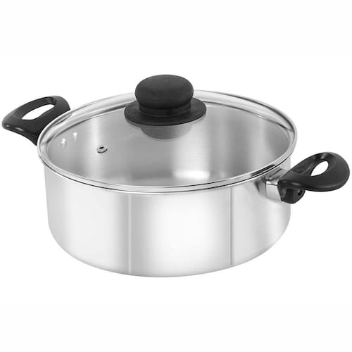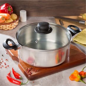O design moderno com alto brilho não deixa de lado a alta durabilidade e qualidade do produto. TAMPA DE VIDRO TEMPERADA Acompanham a tampa de vidro temperado com abas inox, saída para vapor e pegador confeccionado também em baquelite.