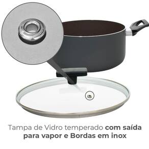 A tampa é feita de vidro temperado com saída para vapor e borda em inox, ideal para você que gosta de sofisticação e elegância em sua cozinha.