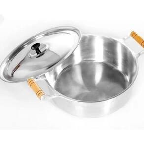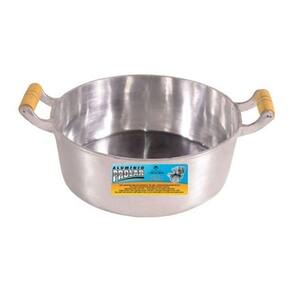 Produzida toda em alumínio batido espessura de 7 mm grossa sem emendas, alças de madeira.
