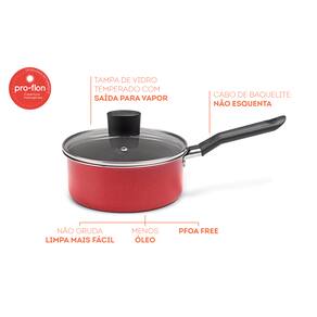 Prática e segura, a panela da linha Garlic, com 18x8 cm e capacidade de 1,75 litro, tem estrutura de alumínio que dissipa melhor o calor, cozinhando o alimento por igual e mais rapidamente. Já o revestimento interno antiaderente não deixa o alimento grudar mesmo com uso reduzido de óleo. De quebra, o material também facilita a limpeza. A tampa é de vidro temperado e possui saída para o vapor. Com cabo de braquelite, material que não aquece, o manuseio da panela, fica mais fácil e seguro. A pintura externa é na cor vermelho. O ciclo de vida do produto pode variar conforme frequência e intensidade da utilização. O produto deve ser descartado (livre de materiais orgânicos) em coletores de resíduos seletivos. A logística reversa não é aplicável._x000D_