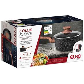 A Panela com Tampa ColorStone Wooden 18?cm da Euro Home é ideal para quem busca praticidade, segurança e beleza na cozinha. Com revestimento antiaderente de 5 camadas, livre de PFOA e metais pesados, ela evita que os alimentos grudem e facilita a limpeza. Possui tampa de vidro com saída de vapor, alças Soft Touch que não esquentam e base compatível com todos os tipos de fogão, inclusive indução. Com capacidade de aproximadamente 2 litros, é perfeita para preparar ensopados, massas, arroz e muito mais, unindo eficiência e um toque de sofisticação.