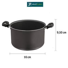 Toda em alumínio, ele possui revestimento antiaderente na cor grafite, permitindo que você faça alimentos muito mais saudáveis, já que não precisa utilizar óleo. Além disso, ela tem as alças e pegadores em baquelite garantindo muito mais segurança e facilidade no manuseio, já que não esquentam. E ela ainda tem capacidade para 2 litros, ideal para toda a família. Sua tampa em alumínio e com saídas de vapor proporcionam um cozimento mais rápido e uniforme. Desfrute da praticidade e eficiência desta