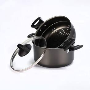 Contém: Cozivapor, Caçarola e Escorredor de Massa; Tampa de Vidro Temperado com Aro de Inox; Alças em Baquelite; Pomel em Nylon; Anti-Térmicos; Corpo e arrebites em Alumínio com revestimento interno e externo de antiaderente 5 camadas;