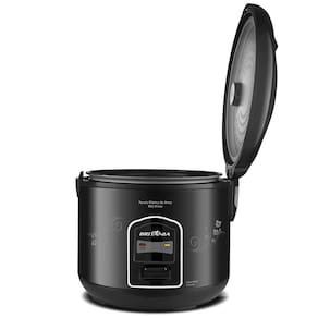 Panela de arroz Britânia Preta PA5 com capacidade para 5 xícaras, tigela antiaderente, acompanha copo dosador e espátula, tampa vedada com alça, botão de travamento, saída de vapor e coletor de água.Lâmpada piloto