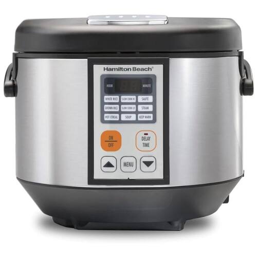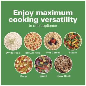 Panela de arroz elétrica com capacidade de 4.5L, funções de arroz branco, arroz integral, cereal quente, vapor, sopa, refogado e cozimento lento. Possui pote interno antiaderente removível e tampa de vidro.Lâmpada piloto
