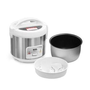 Panela de arroz elétrica EOS 700W com capacidade de 1,8L (10 xícaras), função refogar, manter aquecido e desligamento automático. Acompanha suporte para legumes no vapor, espátula e copo medidor. Tampa de vidro clear glass.Lâmpada piloto