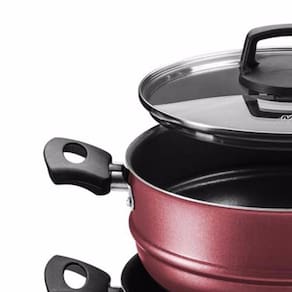 utilizando antiaderente de ultima geração e com 5 camadas. Produto desenvolvido para efetuar refeições completas, utilizando apenas uma boca de fogão, com agilidade e praticidade. Ideal para o preparo em sua base daquela deliciosa Carne, Peixe, Arroz e etc... Em sua parte superior efetuar aquele delicioso refogado, legumes no vapor entre outras delícias, deixe sua imaginação a toda.