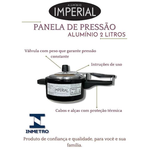 Panela de pressão 2 litros alumínio preta selo inmetro grossa resistente Com a panela de pressão alumínio da Alumínio Imperial você também adquire praticidade e segurança para você e sua família. Seus componentes passam por testes rigorosos e o produto acompanha selo de qualidade INMETRO. Benefícios: - A borracha altamente resistente impede que o ar escape e faça com que a panela perca a pressão interna. - A válvula impede que o limite de pressão seja excedido. - Possui trava de segurança. - Alumínio Informações Técnicas: - Litragem: 2,0L. Marca: Alumínio Imperial