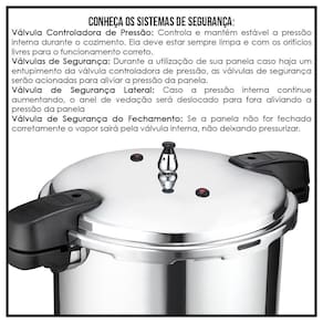 Panela 20 Litros Fechamento Externo Alumínio Cuidados Importantes: Evite bater a panela, deformações podem interferir no fechamento da panela e consequentemente impactam em seu funcionamento. Cuidado com produtos químicos pois podem manchar o alumínio. Ao manusear a panela, enquanto estiver quente, segure apenas as alças. Não utilize a panela em fornos. Não utilize a panela para frituras, ela é recomendada apenas para o cozimento dos alimentos com água. Não deixe no alcance de crianças. Após o cozimento, caso tenha dificuldade em abrir a tampa da panela, não force as alças, pois ainda pode conter pressão interna. Centralize bem a panela com a chama do fogão, nunca deixe as chamas subirem pelo corpo da panela ou ficarem em contato com as alças. Quando remover o anel de vedação e válvulas, certifique-se de colocá-las na posição correta. Características: - Altura: 26,4cm - Altura com tampa: 35,5cm - Diâmetro: 35,5cm - Comprimento com cabo: 48,5cm - Capacidade: 20L - Pressão nominal: 80KPA - Material: Alumínio - Marca: Class Home - Cor: Prateado - Conteúdo: 1 Panela Cuidados antes do uso: Para a limpeza da válvula controladora , puxe-a para cima até desencaixar. Para colocar novamente basta encaixá-la até descer completamente. Pino da válvula controladora pode conter acúmulo de gorduras e restos de alimentos ocasionando o entupimento do pino central gerando um mau funcionamento, danos a panela e até acidentes. Para evitar é indicado sempre antes de usar, limpar o interior do pino com acessórios como limpador/protetor do pino central que acompanha o produto, para fazer a desobstrução da passagem de vapor. Basta tirar o pino para limpar e encaixá-lo novamente.