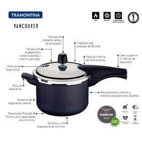 Um dos melhores aromas na cozinha é o de um feijão fresquinho. E se você busca uma panela prática, segura e resistente para preparar essas e outras delícias, pode contar com a Panela de Pressão Tramontina Vancouver em Alumínio com Revestimento Interno e Externo Antiaderente Starflon Max Grafite 20 cm de diâmetro 4,5 L. Perfeita para uso diário, ela é produzida em alumínio e conta com revestimento interno e externo em antiaderente Starflon Max, ambas características que proporcionam o cozimento dos alimentos de maneira uniforme e evitam que eles grudem. Além disso, ela é resistente, eficiente e segura, pois possui três válvulas de segurança para que você possa cozinhar tranquilamente e sem receios. Seus cabos e alça são em baquelite antitérmico e garantem ainda mais segurança durante o uso, pois reduzem a propagação do calor. Com um design moderno e na cor grafite, ela vai levar muito mais estilo e praticidade para sua cozinha!