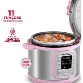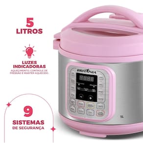 Chega de panelas de pressão complicadas e receitas demoradas, prepare refeições deliciosas e nutritivas em um piscar de olhos. Com a Panela de Pressão Britânia Rosa 5L Digital 11 Funções, seus pratos ficam prontos até 70% mais rápido! São 11 funções pré-programadas para você, desde arroz soltinho até aquela sopa reconfortante. Diga adeus ao medo da panela de pressão! Com 9 sistemas de segurança, cozinhar se torna uma experiência tranquila e prazerosa. O display digital facilita o controle e o timer programável permite que a refeição esteja pronta na hora certa. Seu design não foi pensado apenas para os Pink Lovers, mas sim para complementar o design de todas as casas, sua cor rosa traz o estilo que faltava na sua cozinha. Experimente a praticidade e o sabor que a Panela de Pressão Britânia Rosa 5L Digital proporciona.