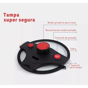 Para maior segurança durante o uso, a panela é equipada com diversos dispositivos de proteção, como botão giratório para fechamento, duas válvulas de trabalho e um escape de segurança. A tampa de vidro permite visualizar o preparo dos alimentos sem a necessidade de abri-la, facilitando o controle do cozimento.
