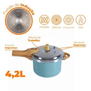 A panela de pressão Ceramiclife Botanika conta com estrutura de alumínio com revestimento cerâmico que cozinha os alimentos por igual e mais rápido, dissipando melhor o calor, proporcionando um maior aproveitamento de nutrientes dos alimentos. Agora com exclusivo fundo de indução, que funciona em todos os tipos de fogões à gás, elétrico, vitrocêramico e os de indução, para você passar menos tempo cozinhando e ter mais segurança durante os preparos. Além disso, suas paredes externas possuem pintura na cor verde trazendo mais leveza para a sua cozinha. Seu cabo e alça de baquelite com revestimento soft touch proporcionam mais conforto e melhor manuseio. Possui 2 anos de garantia e 4 dispositivos de segurança (uma trava, duas válvulas de trabalho e um escape de segurança).