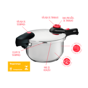 A Panela de Pressão Supra tem corpo em aço inoxidável - que preserva o sabor dos alimentos e conserva seus nutrientes - e fundo triplo - para um cozimento mais rápido e uniforme. Seu principal diferencial é a alta tecnologia que garante total segurança ao produto. A Panela de Pressão possui cinco dispositivos de segurança: válvula de segurança, escape de segurança, anel de vedação, válvula de trabalho e duas pressões de trabalho, todos aprovados pelo Inmetro. Possui fechamento externo, muito mais prático para manusear. Pode ir a lava-louças . Panelas de Pressão Brinox, maior variedade de receitas no seu dia a dia.