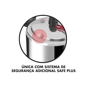 Sistema exclusivo Safe Plus, Valvula controladora de pressao e Valvula de seguranca repetitiva Cabo reforcado com fixacao ultrarresistente Tampa nao cai dentro da panela ao abrir, gracas ao sistema de encaixe. 10 anos de garantia para a estrutura metalica do corpo da panela