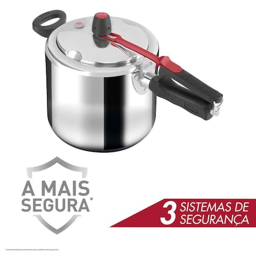 Safe Plus: Um sistema adicional exclusivo que oferece proteção extra.Válvula Controladora de Pressão: Mantém a estabilidade durante todo o processo de cozimento.Válvula de Segurança Repetitiva: Ativada automaticamente em caso de obstrução da válvula controladora. Com a Panela de Pressão Clock + Fechamento Interno 7L, cozinhar torna-se uma experiência ainda mais prazerosa e segura.Clock, a mais segura: Tradição com a robustez de sempre.
