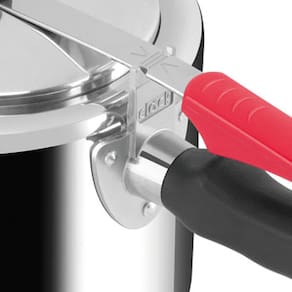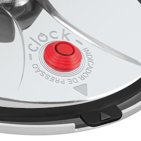 Três sistemas de segurança Equipada com três sistemas de segurança, a Panela de Pressão Clock conta com uma válvula controladora que libera o vapor durante o uso, uma válvula repetitiva que reforça a segurança, e o sistema SafePlus, que desloca o anel de vedação caso a panela fique entupida, liberando a pressão de maneira segura.
