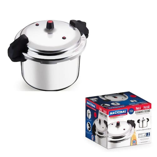 Panela de Pressão com Trava Fechamento Externo 12 Litros Panela de Pressão com Fechamento Externo 12 Litros A panela de pressão fechamento externo 12 Litros traz todas as vantagens do preparo por pressão, como a retenção das propriedades naturais de cada alimento e o cozimento rápido. Sua tecnologia acelera ainda mais o cozimento, poupando gás. Confeccionada em alumínio, ela é muito resistente e durável. Muito segura, tem alça de baquelite. A válvula removível facilita a limpeza. Por fim, oferecendo maior rapidez no cozimento de alimentos e consequente economia de energia em comparação com outras existentes no mercado com pressão de trabalho inferiores. São ótimas características que trazem maior qualidade a panela: -uma panela de pressão turbinada de 80kpa. Menor tempo de cozimento; -acessórios anatômicos e antitérmicos; -dois selos de segurança em silicone; -anel de vedação em silicone; -válvula controladora de pressão; Dimensões da Panela de Pressão com Fechamento Externo 12 Litros Panela : Altura 285 mm x Largura 355 mm x Comprimento 442 mm x Litragem 12 Lts Embalagem: Altura 27 cm x Largura 38 cm x Comprimento 38 cm x Peso: 6,000kg Informações Gerais: Marca: Alumínio Nacional Composição: Tampa e corpo de alumínio, Alça em baquelite, Válvula Repetoitiva e Anel de vedação em Silicone, Peso em Zamac Litragem: 12Lts Contém selo do InMetro