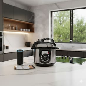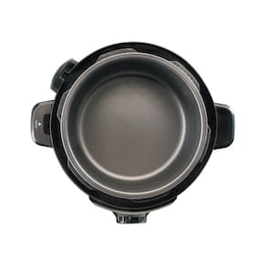 Panela de pressão elétrica com painel digital, timer e funções pré-programadas. Cuba interna removível com revestimento antiaderente. Corpo em aço escovado e tampa em aço inoxidável. Possui dispositivos de controle de pressão e travas na tampa. Função Manter Aquecido.Lâmpada piloto