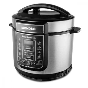Painel digital com receitas predefinidas, função aquecer, timer de 24 horas, cuba antiaderente removível, válvula de segurança, design sofisticado em aço inoxTipo