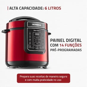 Com a Panela de Pressão Elétrica Digital da Mondial, você vai cozinhar de maneira segura e com muita praticidade no uso! O painel digital facilita a escolha das receitas e do tempo de preparo. As 14 funções predefinidas são: feijão, arroz, carne, frango, peixe, frutos do mar, carne de porco, macarrão, legumes, lentilha, milho, bolo e pudim, além da função refogar. É só selecionar e mãos à obra!