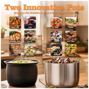 Versatilidade DualPot: Alterne facilmente entre a panela premium de aço inoxidável 304 para refeições substanciais e a panela de cerâmica antiaderente para pratos delicados, tudo em uma única panela. Potência de Cozimento Turbo: 1,7x a pressão atmosférica desbloqueia resultados de qualidade de restaurante em uma fração do tempo - um cozido macio em apenas 40 minutos contra 2 horas no fogão! Maestria Culinária 12 em 1: Cozinhe à pressão, ensopados, arroz, refogue, asse e muito mais - perfeito para tudo, desde arroz soltinho até sobremesas decadentes. Segurança Inteligente, Controle Sem Esforço: Sistema de liberação de vapor mais seguro com desligamento automático. Proteção contra superaquecimento para operação sem preocupações. Trava de tampa com um toque para uso intuitivo. Limpeza? Feita em Segundos: Tanto as panelas quanto a tampa são seguras para lava-louças - sem esfregar, sem complicações. Refeições Planejadas Perfeitamente: Programe e esqueça! Início com atraso de 24 horas garante refeições quentes exatamente quando deseja. Inspiração de Receitas Bônus: Estimule sua criatividade com um livro de receitas repleto de receitas globais.