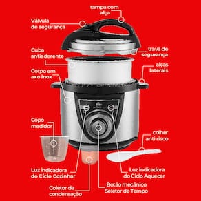 Panela de Pressão Elétrica Mecânica com corpo em aço inox, cuba antiaderente removível, painel mecânico com seletor de tempo, função aquecer automática, trava de segurança e válvula de pressão, alças laterais resistentes, tampa com alça superior, luz indicadora de funcionamento (cozinhar/aquecer), cabo elétrico removível.Acompanha copo