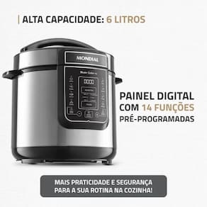 Panela de Pressão Elétrica Digital Master Cooker 6L, você pode preparar diversas receitas. Sua versatilidade é um ponto forte: as 14 receitas predefinidas facilitam o preparo de uma variedade de pratos, desde arroz e carnes, até legumes e sobremesas. O painel digital é intuitivo e fácil de ler. Possui acabamento em aço inox para se destacar em sua cozinha. Aproveite a qualidade Mondial!