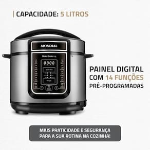 Com a Panela de Pressão Elétrica Mondial Master Cooker PE-38, você ganha tempo, segurança e qualidade no preparo das suas receitas favoritas. Ideal para famílias modernas que buscam agilidade sem abrir mão do sabor, ela se adapta à sua rotina e revoluciona a forma de cozinhar.