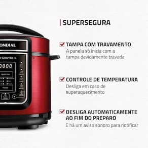 Praticidade, segurança e sabor para sua cozinha! A Panela de Pressão Elétrica Master Cooker Red 5L Mondial é perfeita para quem busca tecnologia e facilidade no preparo das receitas do dia a dia. Com painel digital e 14 funções pré-programadas, você cozinha carnes, feijão, legumes, sopas, arroz, pudins e muito mais com apenas um clique. Além disso, conta com timer programável de até 24 horas, função Aquecer e cuba antiaderente removível para limpeza fácil.