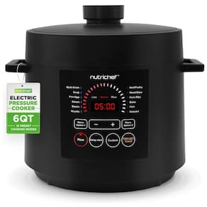 Desfrute de uma culinária versátil com a Panela de Pressão Elétrica NutriChef, que oferece 9 modos predefinidos. Cozinhe, asse, coza a vapor, doure, refogue e faça guisados com precisão, simplificando o preparo das refeições com opções versáteis. Controle digital inteligente permite programar o cozimento com ajuste de tempo e temperatura no visor LED digital e painel de controle sensível ao toque. A cocção sob pressão mantém os sabores naturais, enquanto o exclusivo modo Open Lid adiciona versatilidade. Prepare refeições até 70% mais rápido com a panela de pressão elétrica de 5,7 litros. Temporizador ajustável de até 240 minutos para uma preparação eficiente adaptada ao seu estilo de vida agitado. Design seguro e resistente a manchas, garantindo uma utilização sem preocupações. A embalagem vem com uma xícara de medição e colher de arroz para uma preparação conveniente. Adquira já a Panela de Pressão Elétrica NutriChef, uma adição confiável ao seu arsenal culinário.