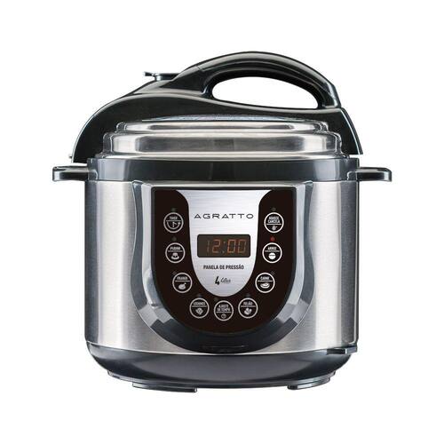 Segura, moderna, prática e bonita.Uma variedade de pratos ao seu dispor. As Panelas de Pressão Agratto são ideais para sua residência.Com dez itens de segurança as Panelas Agratto são muito mais seguras que uma panela de pressão comum. Podem ser usadas no preparo de diversos tipos de alimentos para cozinhar, refogar, fritar ou aquecer.? Painel eletrônicoCom timer eletrônico e diversas programações. ? Cuba antiaderente Com capacidade de quatro litros é removível e antiaderente. ? Mais segurança Dez itens de segurança para sua proteção e alça isotérmica. ? Corpo em inox e aço escovado. Um toque de beleza à sua cozinha. ? Pode ser levada à mesa Pode ser levada diretamente à mesa para servir a refeição. ? Conjunto para panelas Copo medidor, colher de alimentos e reservatório de água. Potência 800WVoltagem 127vGarantia 12 meses