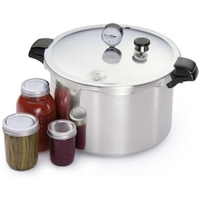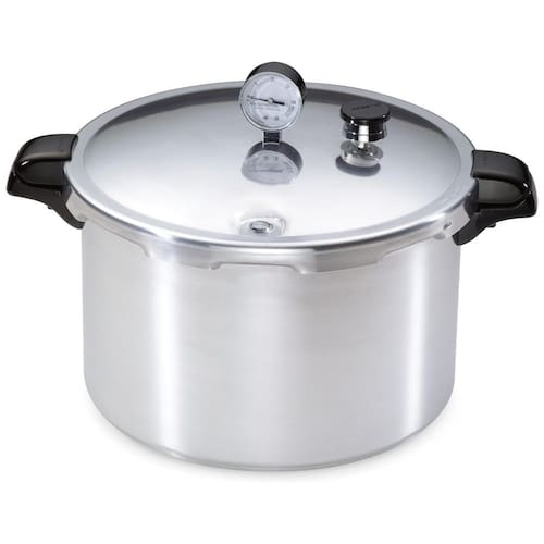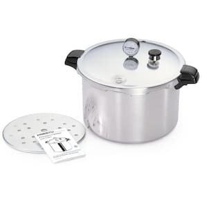 A enlatadora de pressão Presto de 15,1 litros é uma ferramenta de qualidade profissional feita de alumínio resistente e durável, projetada para enlatados de pressão domésticos fáceis e confiáveis. Funciona também como enlatador de água fervente para conservar frutas, geléias, picles e salsa em potes de meio litro e meio litro. Funciona em gamas a gás, elétrica e smoothtop. O manômetro de luxo registra pressões de processamento precisas, o que é especialmente importante em áreas de grande altitude. A trava especial da tampa de ventilação permite que a pressão aumente somente quando a tampa está fechada corretamente e evita que a tampa seja aberta até que a pressão seja reduzida com segurança. Também fornece uma indicação visual da pressão dentro do Canner. Prático para usar como panela de pressão de grande capacidade para preparar carnes, aves, sopas, sobremesas e muito mais. Inclui um suporte para cozinhar e conservar e um livro de receitas com instruções de 80 páginas, fácil de seguir, para conservar e cozinhar sob pressão. Frasco de vidro normal Capacidade 12 meio litro, 10 litro ou 6,53 litros meio litro e litro apenas para processamento de água fervente. A enlatadora de pressão Presto 15,1 litros é mais do que adequada para qualquer necessidade de enlatamento doméstico. Além disso, o anel de vedação deve ser removido após cada utilização para permitir a limpeza da borda interna da tampa. Um folheto detalhado de instruções e receitas está incluído.