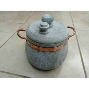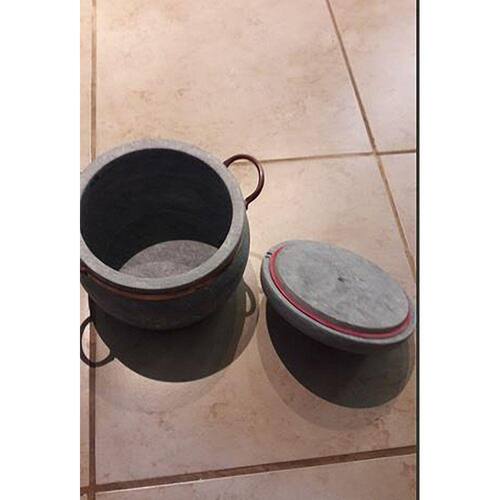 Panela de pressão em pedra sabão com longa durabilidade; Retém o calor por longo deixando o alimento quente por muito mais tempo.