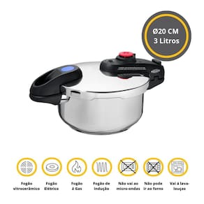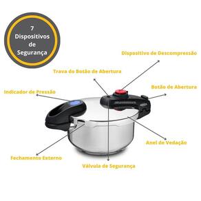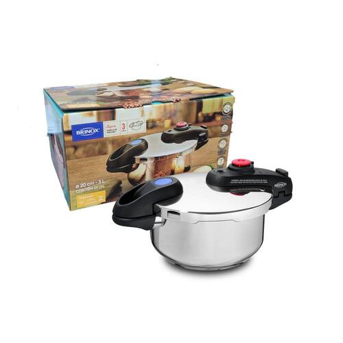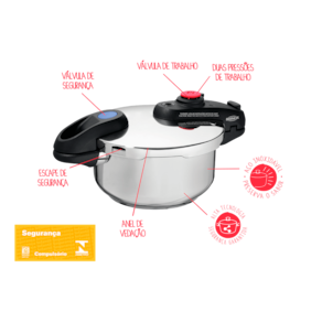 A Panela de Pressão Supra tem corpo em aço inoxidável - que preserva o sabor dos alimentos e conserva seus nutrientes - e fundo triplo - para um cozimento mais rápido e uniforme. Seu principal diferencial é a alta tecnologia que garante total segurança ao produto. A Panela de Pressão possui sete dispositivos de segurança: válvula de segurança, escape de segurança, anel de vedação, válvula de trabalho e duas pressões de trabalho, todos aprovados pelo Inmetro. Possui fechamento externo, muito mais prático para manusear. Pode ir a lava-louças . Panelas de Pressão Brinox, maior variedade de receitas no seu dia a dia. Acompanha ferramenta para limpeza.