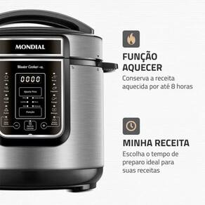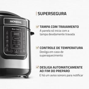 A Panela de Pressao Digital Mondial PE60 e uma opcao pratica e eficiente para quem busca agilidade e conforto na cozinha. Com uma capacidade de 6 litros, ela atende bem a familias de tamanho medio e e ideal para preparar refeicoes para varias pessoas de uma vez. Seu design moderno e compacto facilita o armazenamento, enquanto o painel digital torna a operacao mais simples e intuitiva.