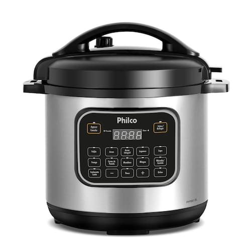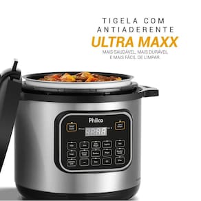 Prepara diversos tipos de alimentos; Painel com controle digital e fácil acesso as funções; Visor digital para acompanhamento da programação e dos preparos; 12 funções pré-programados: Feijão, Arroz, Arroz integral, Legumes, Sopa, Frango, Carne de Panela, Mandioca, Mingau, Músculo/Costela, Cozimento lento e grãos. Função Refogar/Fritar, para dourar temperos e outros alimentos antes de cozinhar na pressão, deve ser utilizada com a tampa aberta; Função aquecer, mantém os alimentos aquecidos a uma temperatura aproximada de 70°C após o cozimento. Função Grãos, 4 modos de preparo de grãos pré-programados: milho, lentilha, grão de bico e pinhão; Timer programável, permite programar o preparo dos alimentos com até 24 horas de antecedência; Tigela removível com capacidade de 8L, possui revestimento interno antiaderente, fácil de usar e limpar; A tigela possui escalas para preparar até 16 xícaras de arroz cru; Suporte para apoiar a colher no aparelho; Suporte para apoiar a tampa no aparelho; Válvula de alívio de pressão removível; Alças laterais, facilidade para transportar o produto; Silenciosa, não libera vapor durante o cozimento dos alimentos; 9 dispositivos de segurança; Tampa com travamento de segurança; Sinal sonoro, a panela emite sinal sonoro após o preparo dos alimentos; Cordão removível, mais prático de levar a panela à mesa; Acompanha espátula e copo dosador; Pés antiderrapantes; Composição: Metal e plástico, tigela em alumínio.Lâmpada piloto