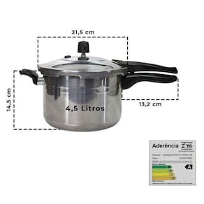 Panela de Pressão Speed 4,5L Polida Fechamento Externo. Perfeita para cozinhar de maneira rápida, eficiente e segura. Capacidade de 4,5 litros, ideal para as refeições do dia a dia. Possui fechamento externo, facilitando a abertura e o fechamento. Design polido, trazendo beleza para sua cozinha. Conta com anel de vedação e válvula controladora de pressão em silicone. Válvula de segurança em alumínio para durabilidade e resistência. Três sistemas de segurança: pino de segurança no cabo da tampa, janela lateral para abertura do anel e válvula de segurança. Trava mecânica na tampa para limitar o movimento de giro. Dimensões aproximadas: altura 18cm, largura 23cm, comprimento 41cm e diâmetro de 20cm. Compacta e perfeita para qualquer cozinha. Adquira a sua Panela de Pressão Speed 4,5L Polida Fechamento Externo e desfrute de refeições rápidas e deliciosas