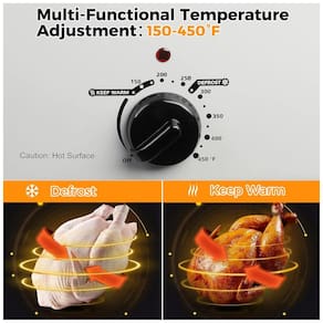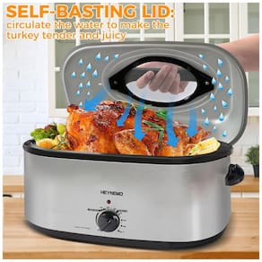 Grande capacidade de 22 litros, tampa alta acomoda peru. Tampa auto reguente para alimentos mais saborosos. Rack de elevação incluído para alimentos grandes. Temperatura ajustável multifuncional e manter a função quente, você pode assar, assar, cozinhar lentamente e servir. Poderoso 1450W AC120V, torrador de aço inoxidável, pés antiderrapantes e alça de toque frio para segurança ao usar. Pote e tampa removíveis, fáceis de limpar e laváveis, controle de temperatura em toda a gama.Lâmpada piloto