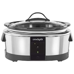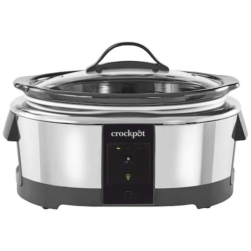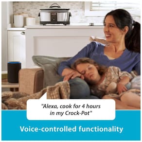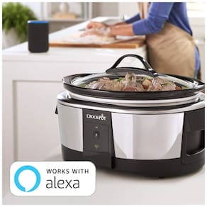 Panela elétrica de cozimento lento programável Crock-Pot com capacidade de 5,7 litros, controle de voz via Alexa, 880W, e acabamento em aço inoxidável.Lâmpada piloto