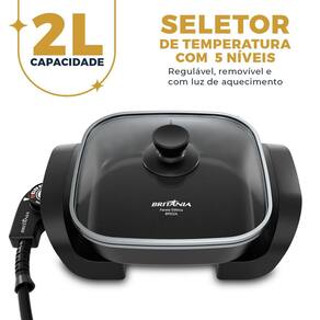 A Panela Elétrica Britânia 2L 5 Temperaturas 650W BPE02A é a companheira ideal para quem busca praticidade e sabor na cozinha. Com ela, você prepara desde um delicioso café da manhã até um jantar completo, sem se preocupar com a bagunça e a limpeza. Com capacidade de 2 litros, a Panela Elétrica Britânia é perfeita para preparar refeições para toda a família. Seu revestimento antiaderente facilita a limpeza e garante que seus alimentos não grudem. Além disso, as alças com toque frio proporcionam segurança durante o manuseio, evitando queimaduras. Desenvolvida com 5 níveis de temperatura ajustáveis, permitem que você escolha a temperatura ideal para cada tipo de alimento, ou seja, garante resultados perfeitos. Já a tampa de vidro temperado permite que você acompanhe o preparo dos alimentos sem precisar abrir a panela. Transforme a sua cozinha com a Panela Elétrica Britânia BPE02A! Tenha mais praticidade, segurança e sabor em suas refeições. • Revestimento: Base água • Potência: 650W • Seletor de temperatura: 5 níveis de temperatura máxima até 230 graus • Capacidade (L): 2L • Tampa com saída de vapor • Material da tampa: Vidro temperado • Alças: Alças laterais com toque frio • Pés antiderrapantes • Luz indicadora: Luz indicadora de aquecimento.