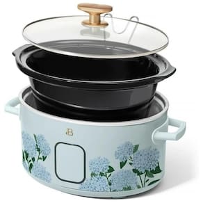 Panela elétrica Slow Cooker digital programável de 5,7 litros da linha Beautiful, com acabamento Hydrangea Floral, projetada para cozimento lento de porções familiares com controle eletrônico de tempo e aquecimento. A cuba interna em cerâmica e a tampa de vidro temperado proporcionam distribuição uniforme de calor, enquanto o painel com comando por toque permite selecionar funções e ajustes de forma prática.