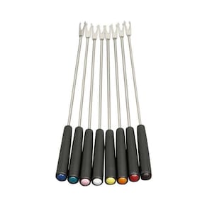 Panela elétrica para fondue em aço inox escovado com tampa de vidro temperado. Possui revestimento interno antiaderente, termostato com 8 níveis de ajuste de temperatura (44°C a 180°C) e sistema de aquecimento encapsulado para distribuição uniforme de calor. Inclui 8 garfos com identificadores coloridos e aro de suporte.Porta fio