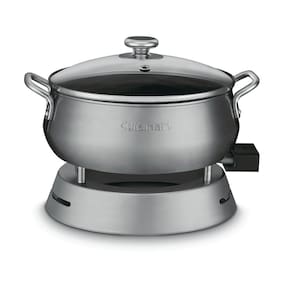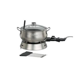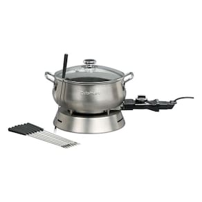Panela elétrica para fondue em aço inox escovado com 8 níveis de controle de temperatura (44°C a 180°C). Possui revestimento interno antiaderente, tampa de vidro temperado, sistema de aquecimento encapsulado e capacidade de 2,84 litros. Inclui 8 garfos com identificadores coloridos e aro de suporte.Porta fio