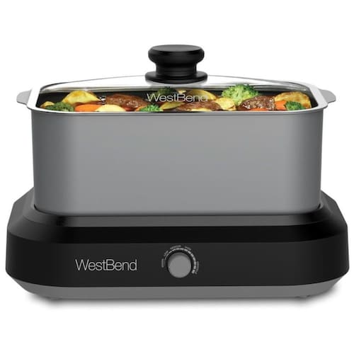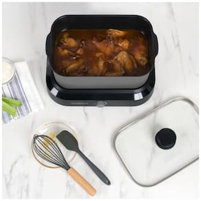 Panela elétrica com capacidade de 5 litros, interior antiaderente, tampa de vidro resistente ao calor e base multifuncional.Lâmpada piloto